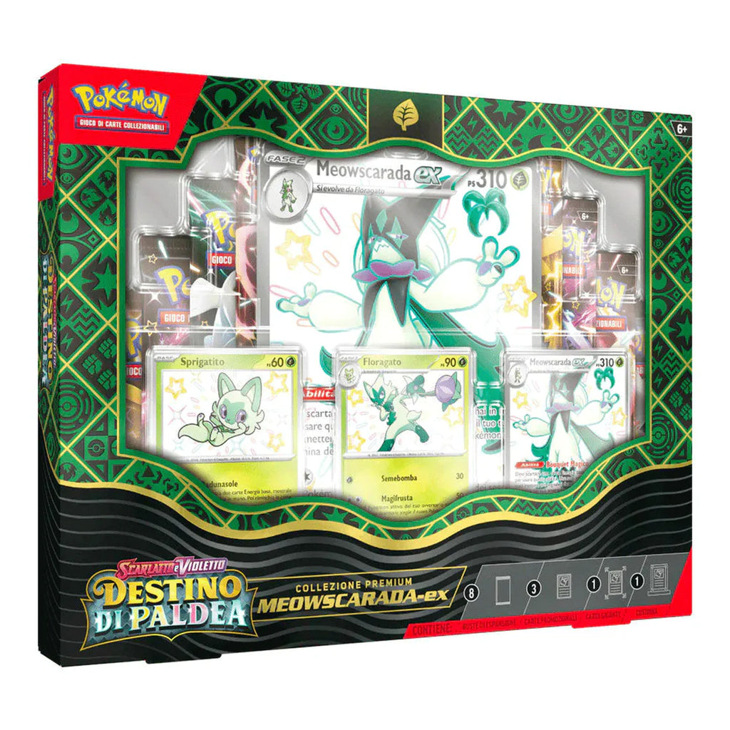 La Collezione Premium Destino di Paldea Meowscarada-ex del GCC Pokemon contiene: